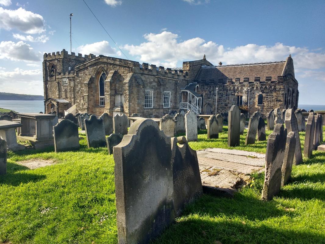 Last year I visited the graveyard and the higher grounds where the ruins of the Abbey are. And as you might know I wrote the song Whitby Abbey Graveyard Blues, about a couple that is buried on the church yard. So I came back to this place to feel and look at what I saw last year. And it is not a surprise; it is always different. But it was still great to be here. I found the headstone of John and Anna, the stained glass windows of the church and the 199 steps of the stairs. This year I took notice of what was written on other stones in the church yard and I saw that a lot of the stones where heavy weathered what makes the texts invisible.